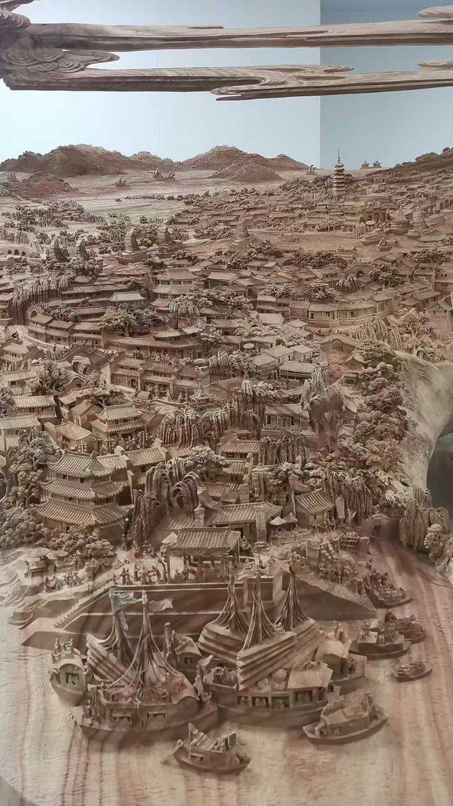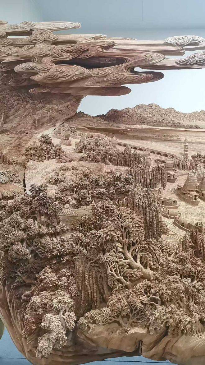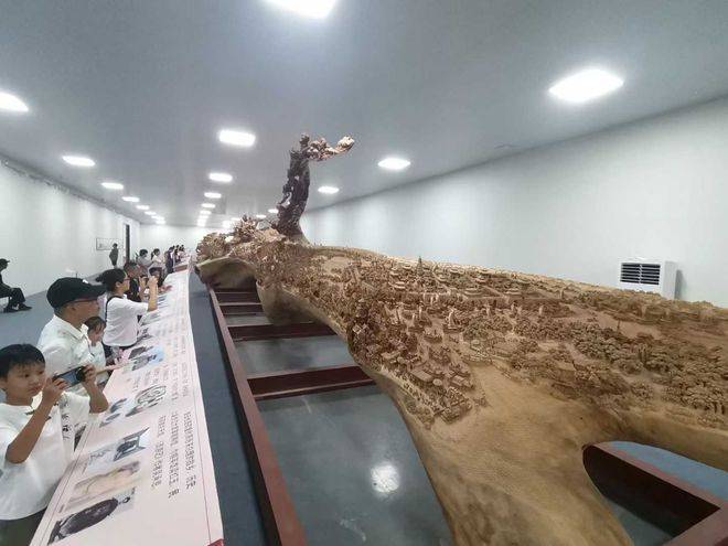 在作品中段的苏州寒山寺场景前,刘鑫炜指出:“郑春辉团队将莆田精微透雕技法与山水长卷意境结合,让静态木雕有了动态叙事 —— 你看这穿梭的舟楫、冒烟的茶肆,完全是‘木头里的《清明上河图》’。” 他透露,名人百科数据库正筹备 “非遗大师” 专题,郑春辉的创作实践将作为核心案例收录,“要让更多人看见这种‘用刻刀讲中国故事’的力量”。