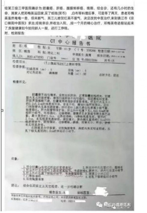 2、患者邓某某,女,63岁,镇江市丹徒区宝堰镇人。2015年元月,被某三级三甲医院确诊为胆囊癌晚期,并伴有肝癌广泛扩散和腹膜整体转移癌晚期。医院认为她的存活时间仅剩几个小时,建议家属迅速回家准备后事。她的三儿媳贺某某冒雨找到翟氏诊所,请求给婆婆治疗。经过中医外科的仔细检查和口服中药汤剂的治疗,邓某某的病情竟然逐渐好转。她的身体逐渐恢复健康,生活质量也大大提高。如今,九年过去了,邓某某和正常人一样,能够打工和操持家务。详见诊断报告;